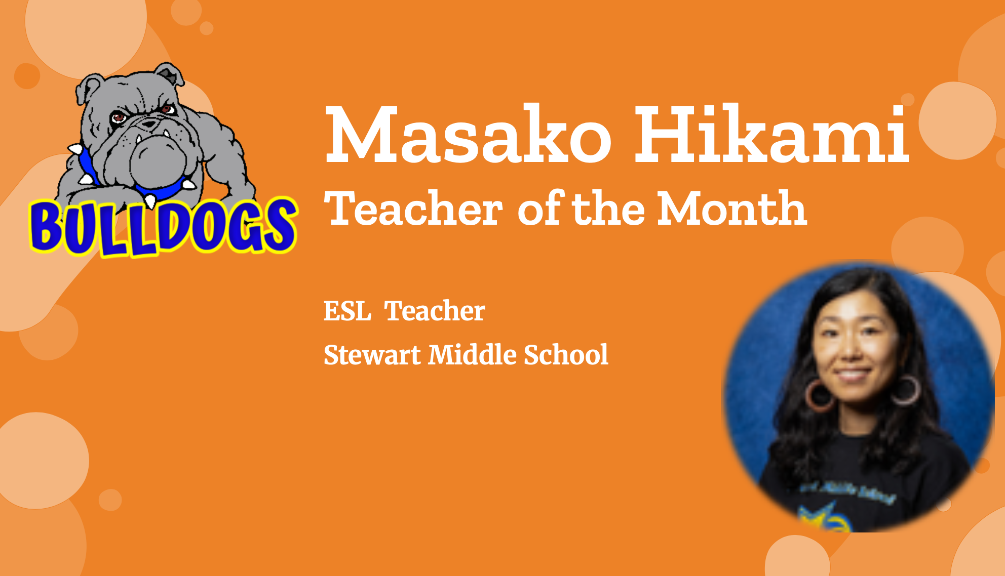 As an ESL teacher at Stewart Middle School, Ms. Hikami works tirelessly to support students learning English as a second language. She bridges the gap between students’ first language and English, helping them develop the academic vocabulary needed for success. Collaborating with other teachers, she creates individualized plans to ensure every student can access instructional materials.